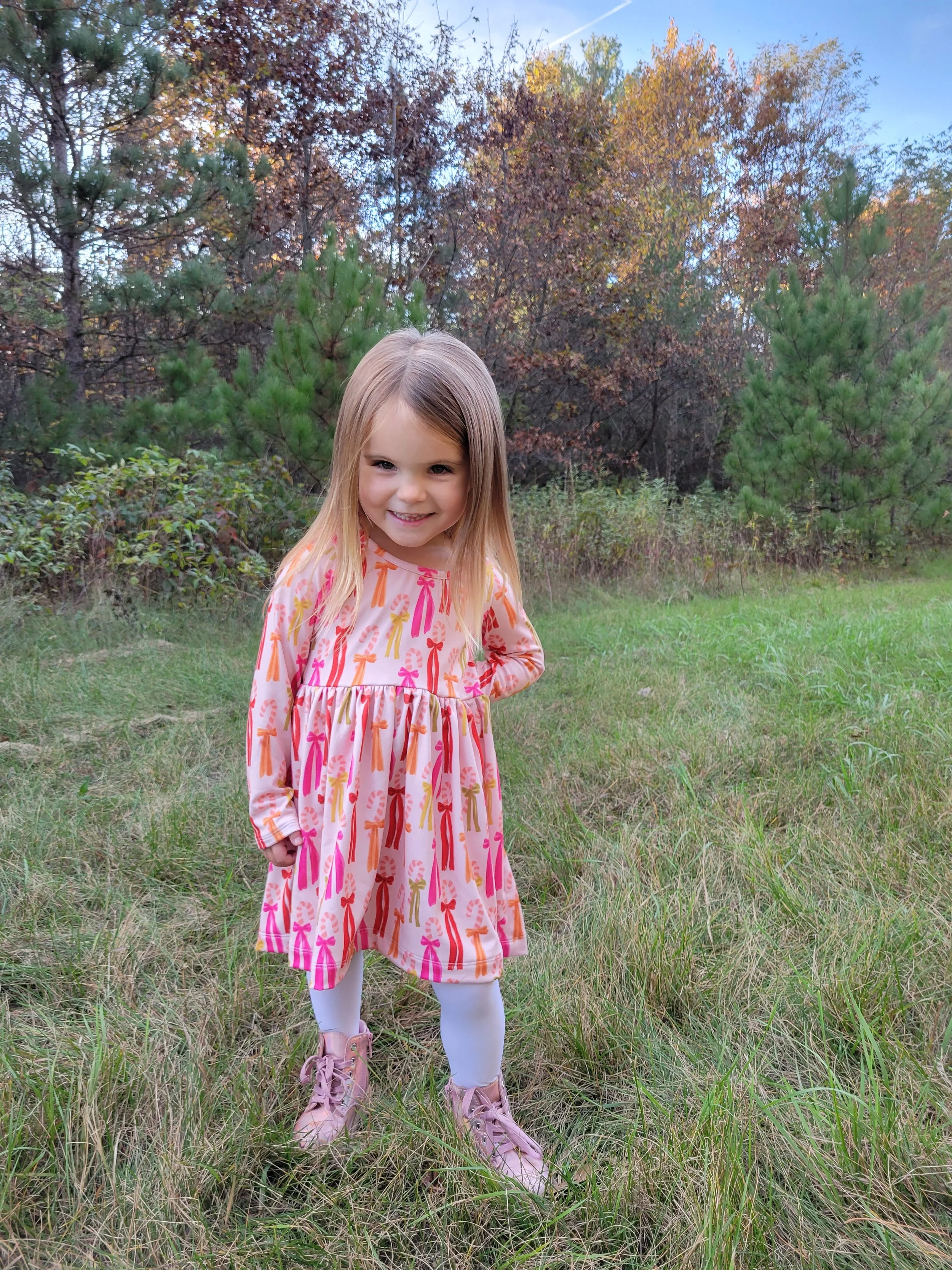 The Rosey Posey dress features long sleeves, this simple yet girlie dress has the perfect fit and of course the skirt allows for lots of twirling. This dress is perfect for all occasions. All of our dresses are so soft that your child will want to wear them on repeat.